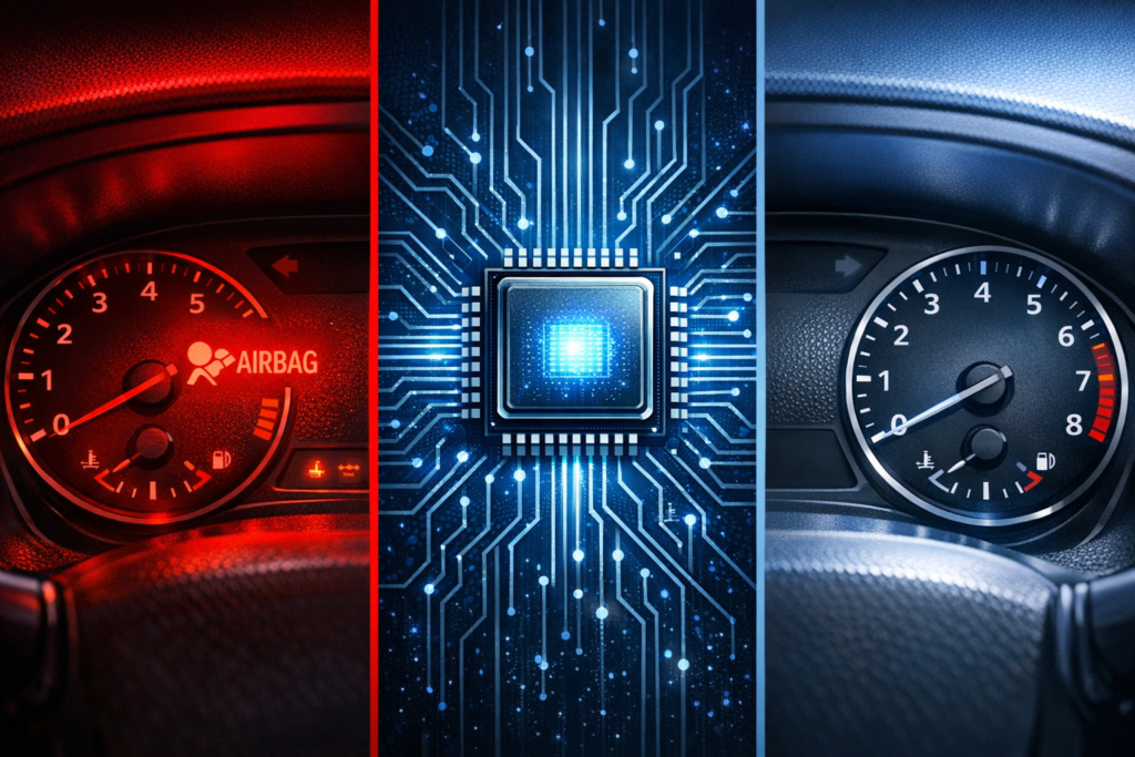 После удара даже не сработавшие подушки блокируются системой. Блок управления фиксирует Crash Data (коды B1421, B1193, C108F, U3000 и др.) . Пока эта запись не удалена программно, новая система безопасности работать не будет. Механика может быть исправна, но «мозг» машины отдаёт команду на блокировку.